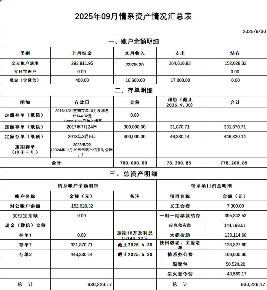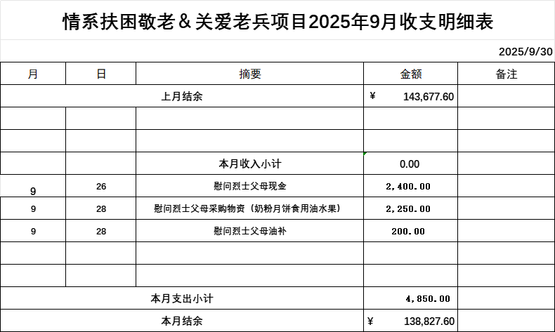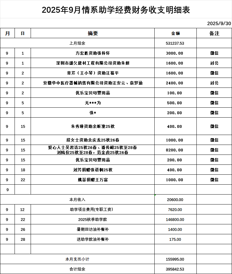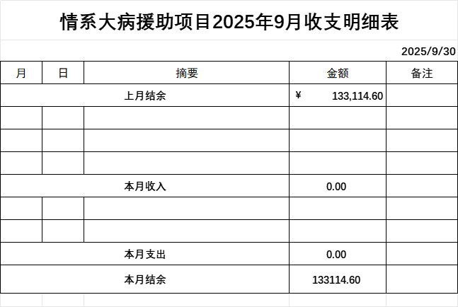 情系爱心联合会2025年9月份财务公开明细 作者: qingxi 分类: 财务公开 发布时间: 2025-10-14 08:25 为确保情系账务的公开、透明,现将2025年9月份财务明细公开发布,望大家知悉并予以监督! 评论内容: