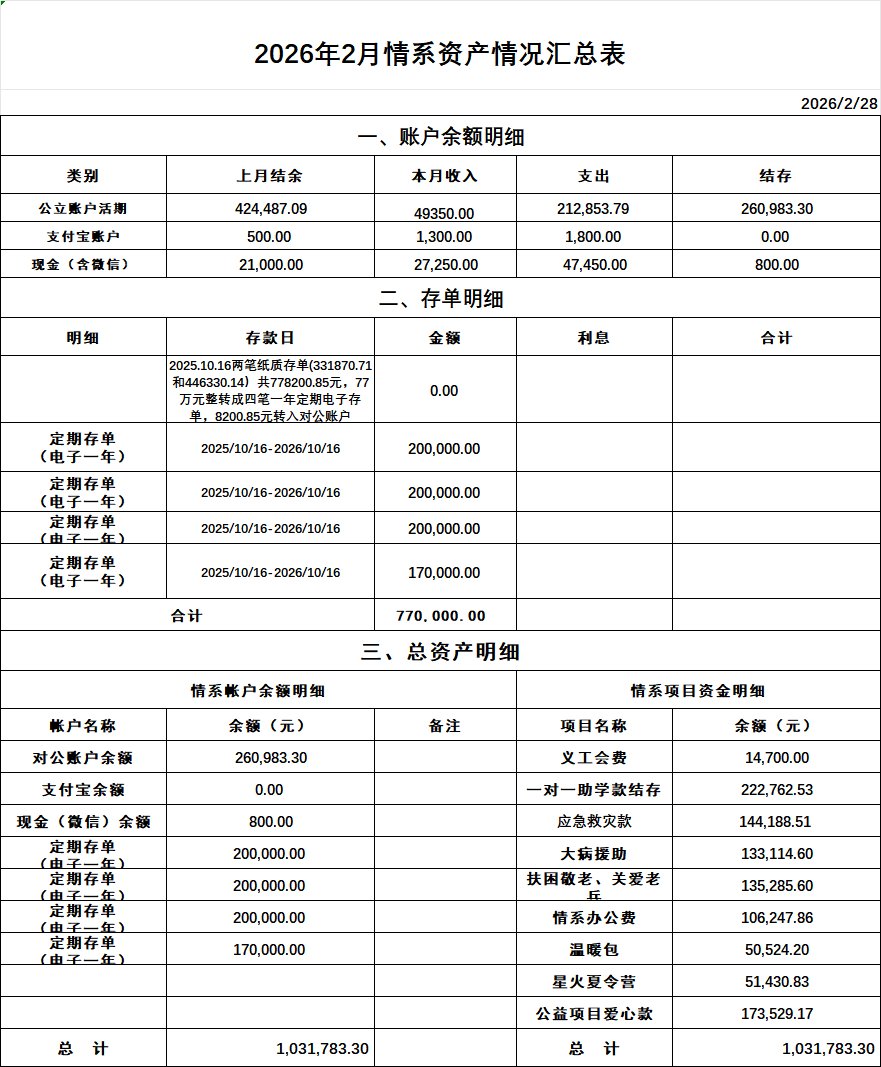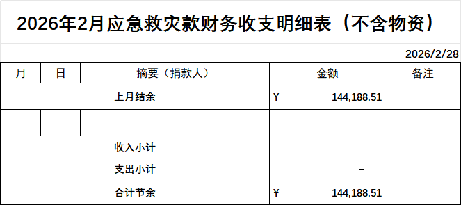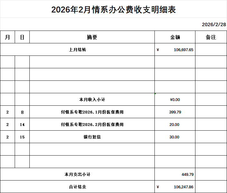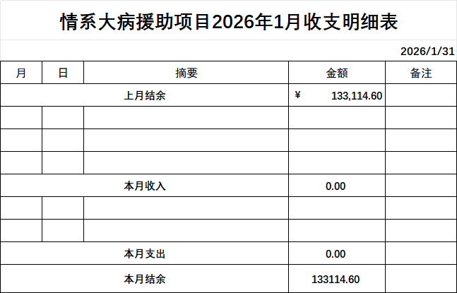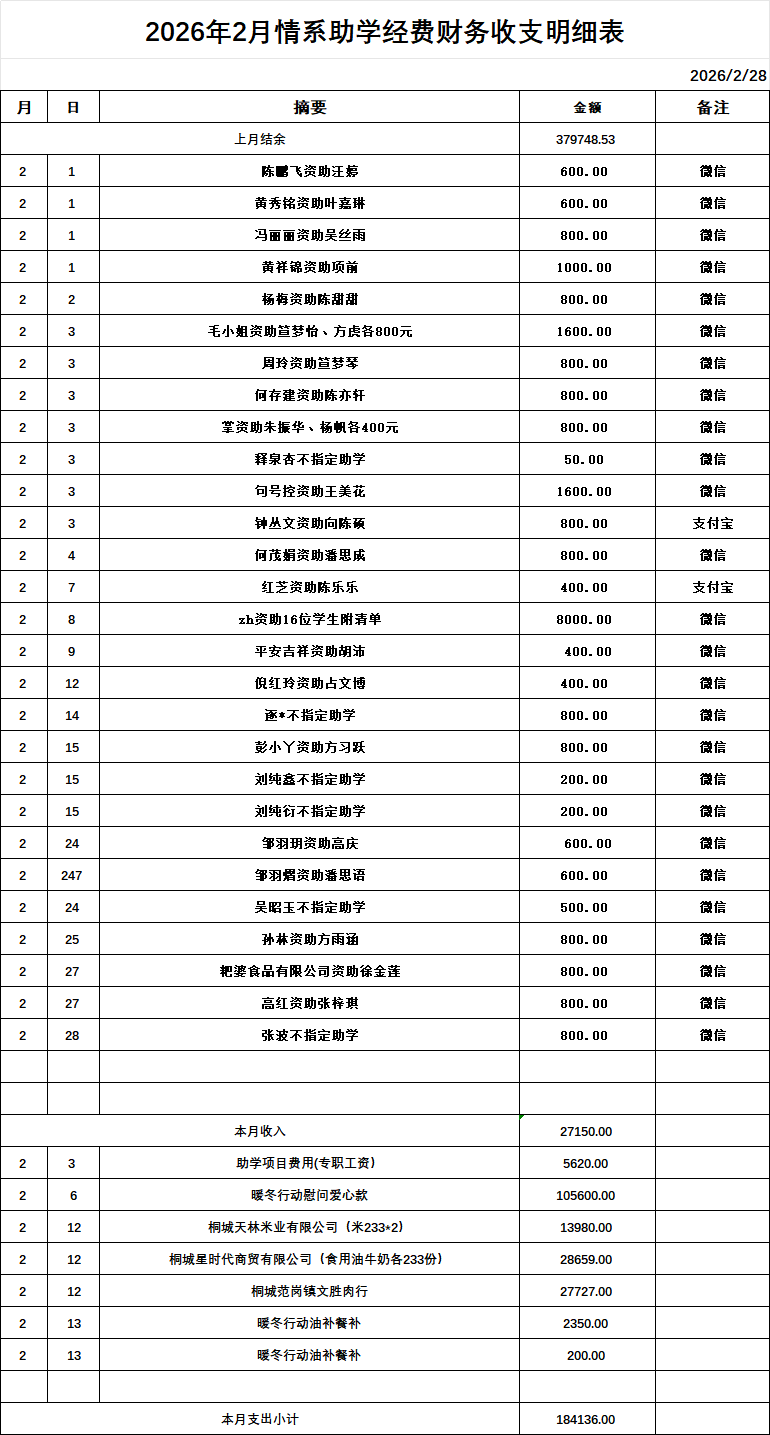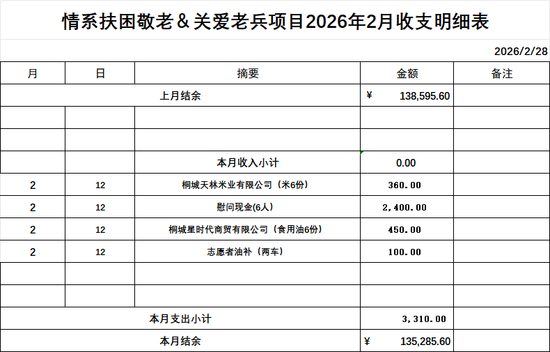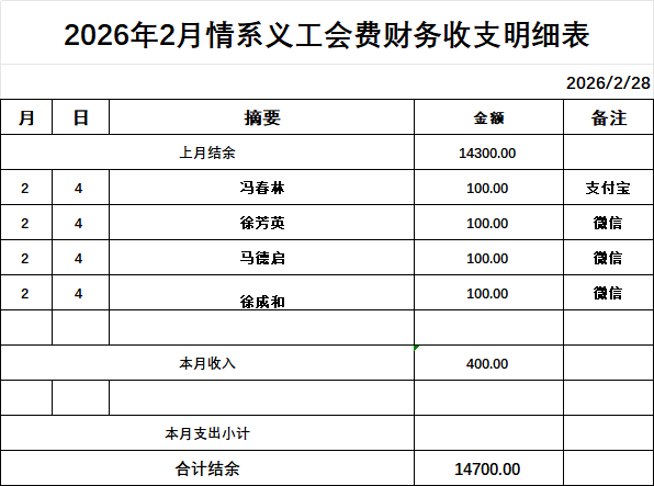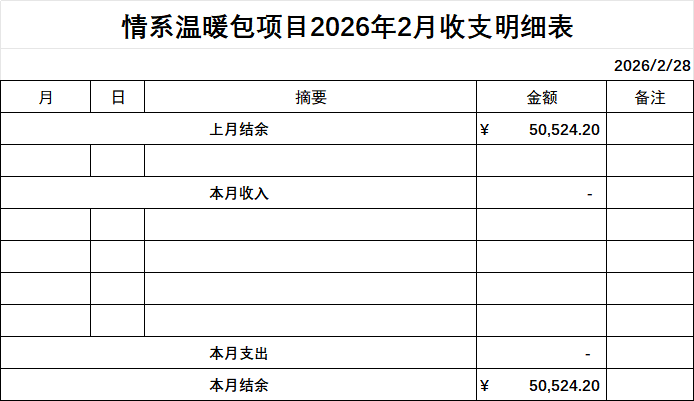 情系爱心联合会2026年2月份财务公开明细 作者: qingxi 分类: 财务公开 发布时间: 2026-03-31 08:44 为确保情系账务的公开、透明,现将2026年2月份财务明细公开发布,望大家知悉并予以监督! 评论内容: